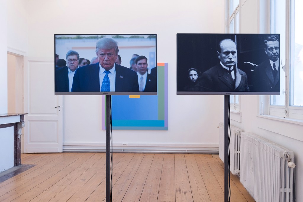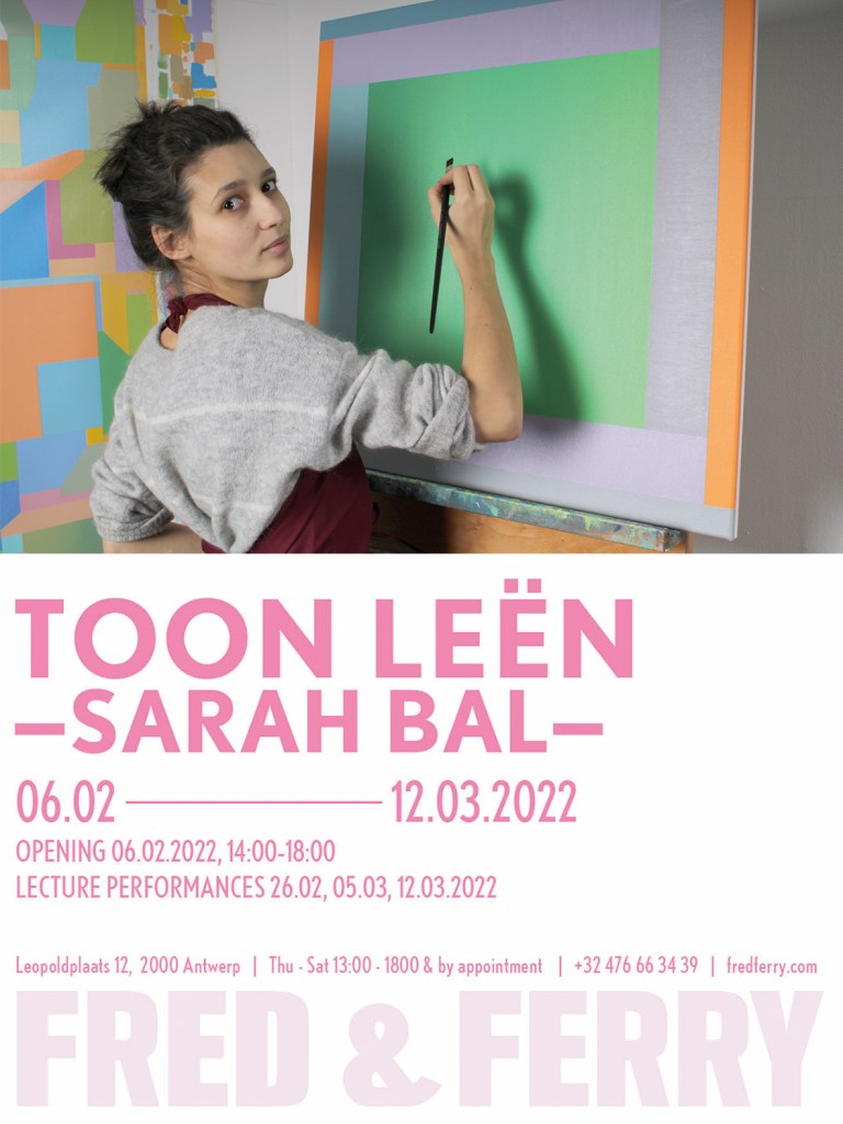 The exhibition —Sarah Bal— featured fourteen paintings and three video lectures that were linked by three elements: the fictional persona of Sarah Bal, an artist fascinated by colour, played by the actress Mathilde Irrmann; excerpts from music by C.P.E. Bach and Franz Liszt, played by pianist Lucas Blondeel; and the figure of the dash, here used to build bridges between politics and art, the serious and the playful, reality and fiction.