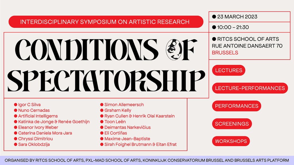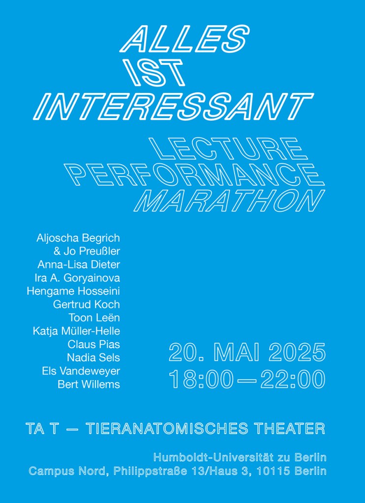 Speakers: Aljoscha Begrich (dramaturge and artistic director, Festival OSTEN) & Jo Preußler (artist and urban dermatologist), Anna-Lisa Dieter (curator, Humboldt Labor, Humboldt-Universität zu Berlin), Ira A. Goryainova (filmmaker, Royal Institute for Theatre, Cinema, and Sound (RITCS), Brussels), Hengame Hosseini (artist), Gertrud Koch (film scholar, em. Freie Universität Berlin), Toon Leën (artist, PXL-MAD, School of Arts & Hasselt University), Katja Müller-Helle (art historian, Humboldt-Universität zu Berlin), Claus Pias (media theorist, Leuphana Universität Lüneburg), Nadia Sels (cultural philosopher, PXL-MAD, School of Arts & Hasselt University, and Ghent University), Bert Willems (psychologist, PXL-MAD, School of Arts & Hasselt University)